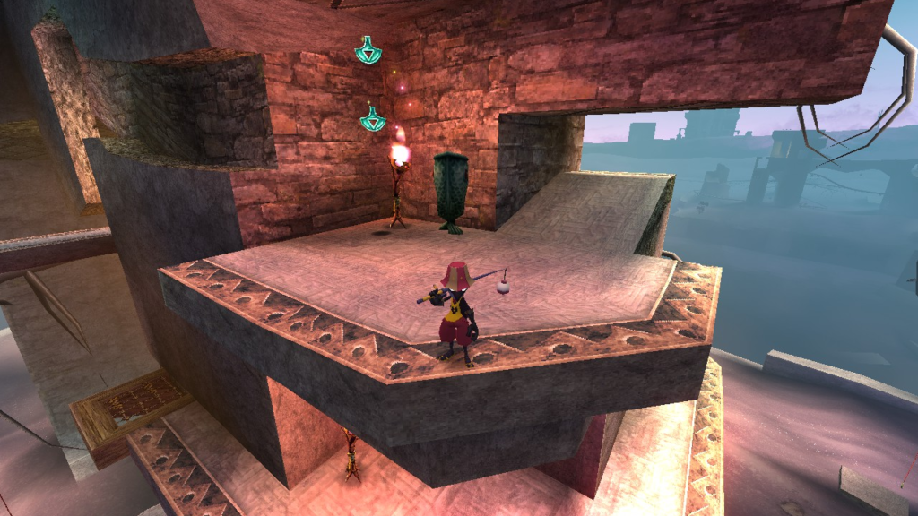 Many 3D platformers load up their main characters with tons of distinct moves and tricks to fit different scenarios. There’s nothing wrong with this approach, but The Big Catch chooses instead to focus on packing a ton of nuance into each move and asking you to understand and utilize that nuance in precise ways. The tools themselves aren’t especially powerful; while you have a dash jump, a floaty spin jump, and a backflip, these moves don’t provide nearly as much height or distance as their equivalents in a game like Super Mario Odyssey, and the signature wall run doesn’t provide any upwards momentum at all upon initiating it – you have to get that upwards momentum yourself. The way you do this is by interacting with the environment and understanding how the game’s physics and momentum work.